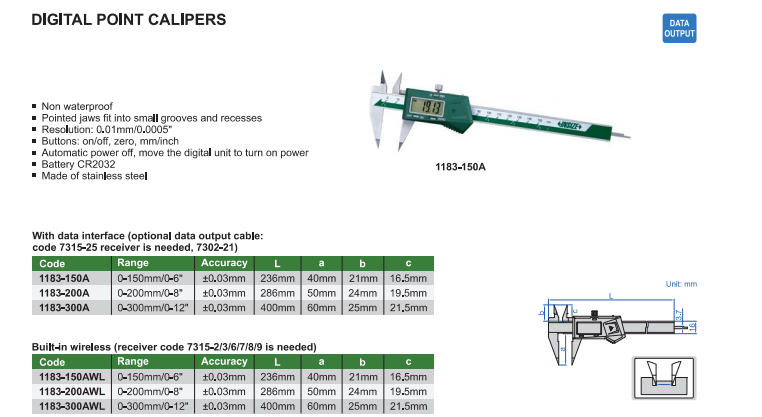 Digitálne posuvné meradlo 0-150 mm so špicatými spodnými ramenami, Insize