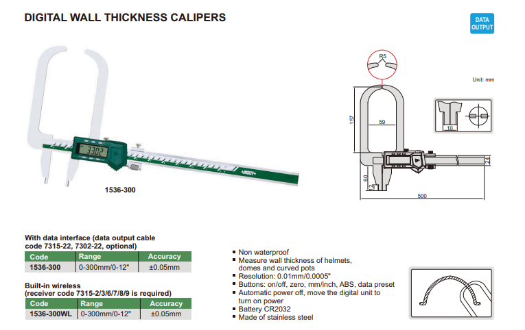 Funkcie: on/off, zero, mm/inch, ABS data preset