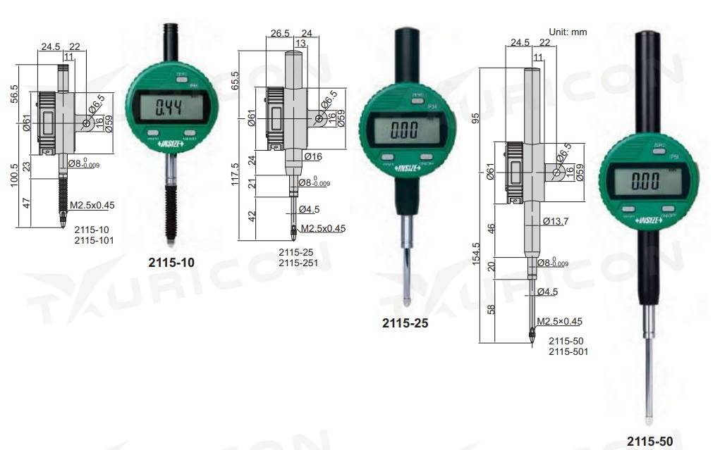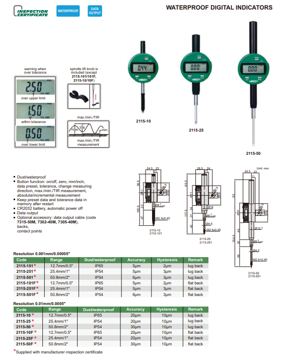 Funkcie: on/off, zero, mm/inch, tolerancie, zmena smeru merania, max./min./TIR hodnota, absolútne/relatívne meranie