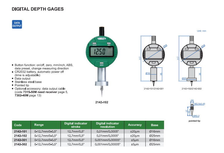 Digitálny hĺbkomer 0-12,7 mm s kruhovou základňou, Insize