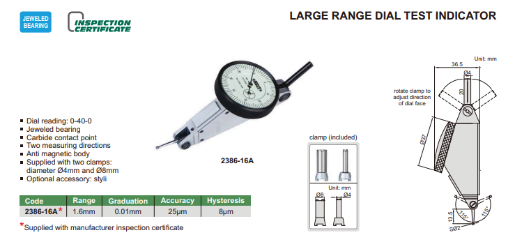 Páčkový odchýlkomer 1,6 mm/0,01 mm s veľkým rozsahom, Insize