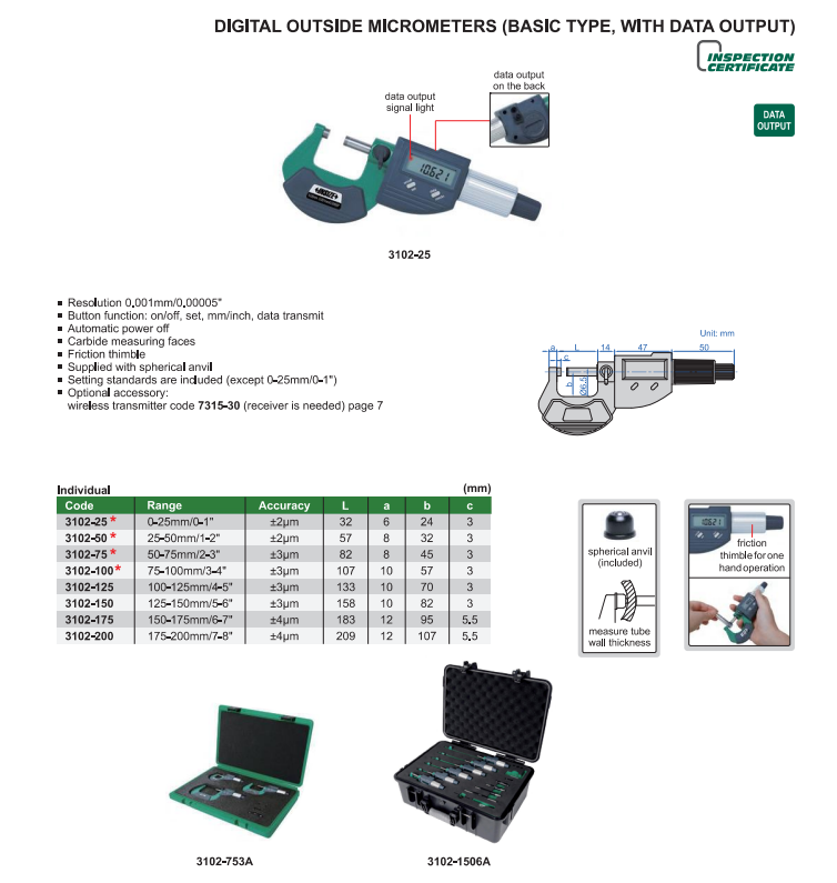 Sada digitálnych mikrometrov 0-100 mm, s výstupom dát, Insize