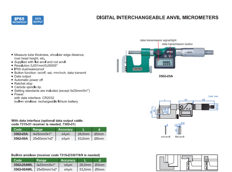 Funkcie: on/off, set, mm/inch, data transmit