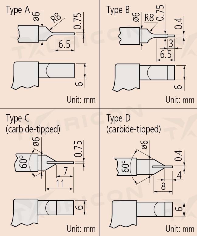 - úzke meracie plochy sú vhodné na meranie úzkych vonkajších drážok, priemerov drážok hriadeľov a ťažko prístupných miest
