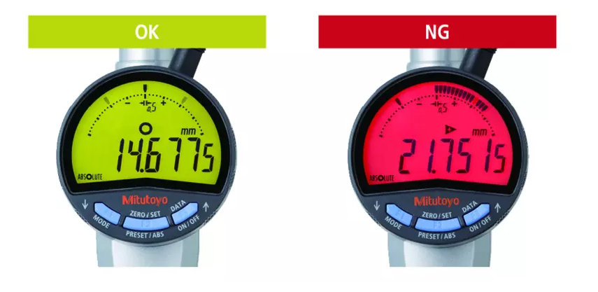 - dvojfarebný (zelený/červený) podsvietený LCD displej s vedľajšou analógovou stupnicou umožňuje vizuálne vyhodnotenie tolerancii Dobrý/Zlý. Ak dôjde k prekročeniu tolerancie, displej zmení farbu zo zeleného na červený.