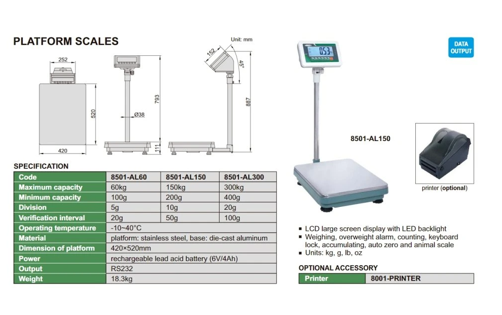 Materiál: platforma (vážiaca plocha) - nerezová oceľ; základňa (podopiera platformu) - hliníková zliatina