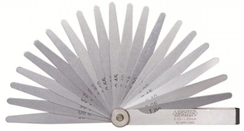 Škárové mierky na ventily Z tvrdenej legovanej ocele Norma DIN 2275 Presnosť merania: +/-(3+T/80) µm, kde T predstavuje hrúbku listu v mikrometroch Počet listov: 28